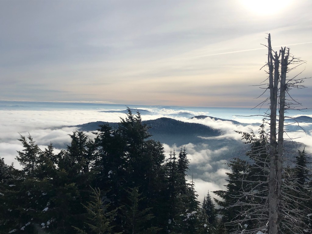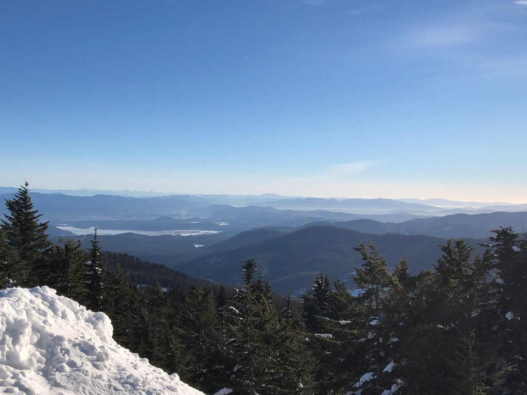The skin up was beautiful, though the “snow” was ice. I had to boot up the last section because it was so icy I kept falling, and of course my ski crampons were in the car……