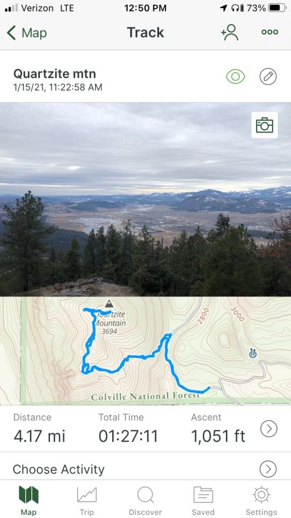 I was able to find a trail head, which is not that easy in this area. I trail ran (and walked) up Quartizite Mountain. Straight up for a mile, then a bit easier for another half mile. I parked about a half mile or so from the trailhead to avoid the solid ice on the roadway and that gave me a bit more mileage. Amazing views from the top. I need to figure out how to get up some of the other peaks near by. A peak a day? So far I am 2/2.