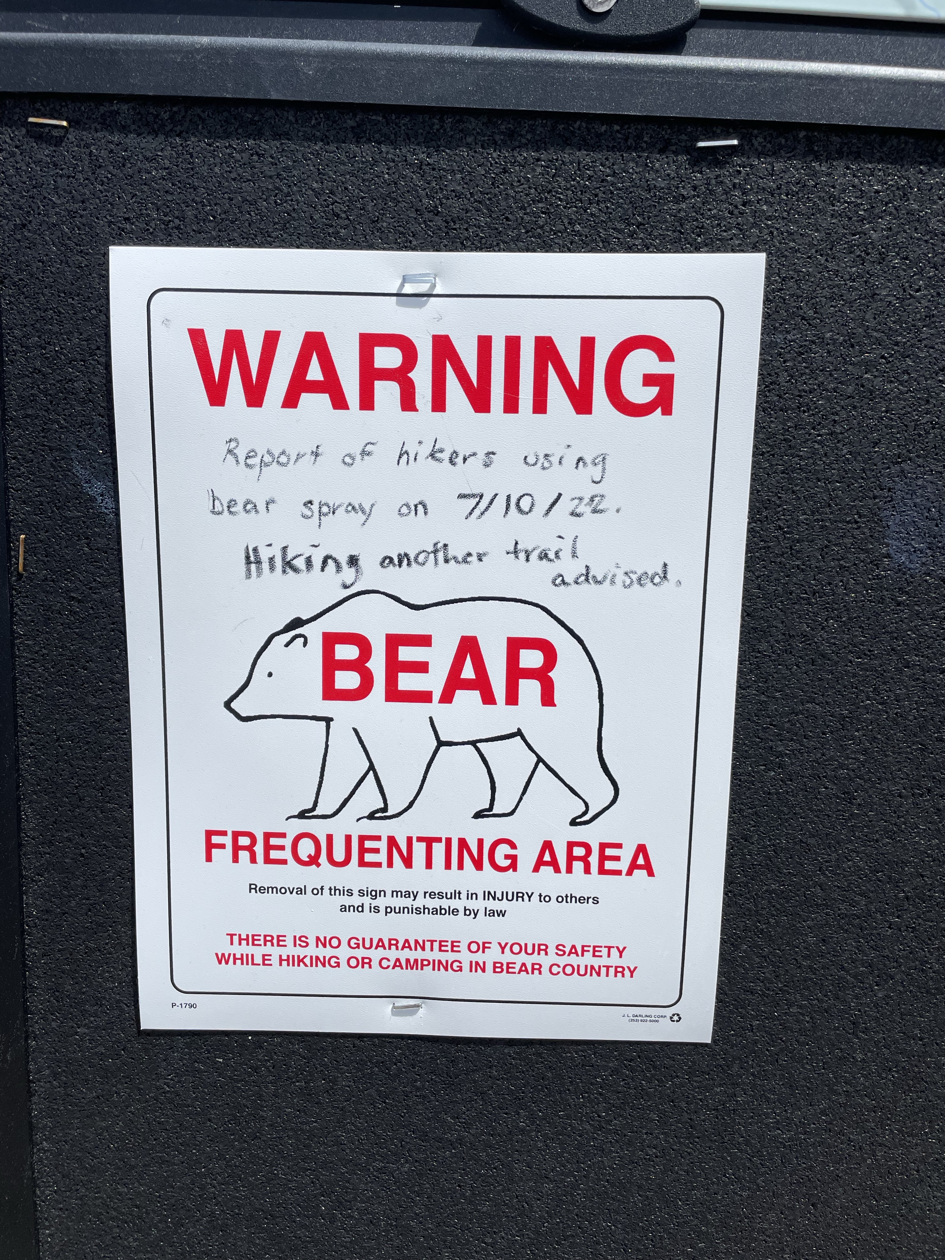 I was singing, and making noise on the trail…..and then came face to face with a juvenile. I thought about the training they gave me…..don’t run, back away. I did. The bear kept coming. I got out my spray, I kept backing away…..the bear kept coming. I sprayed, and then the bear went by.