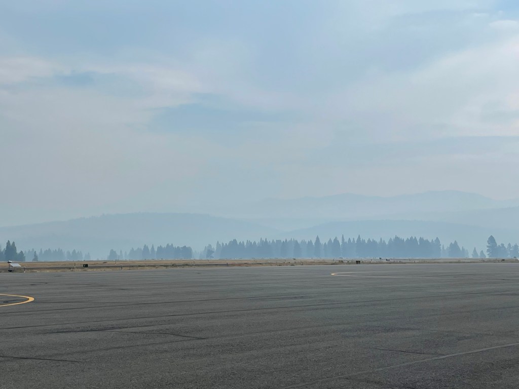 I’m stuck in the smoke in Truckee. I’ve been trying to fly west or north for three days. No luck. I took off yesterday morning, only to turn back to the airport after only four miles of flying. Yikes. It was scary.